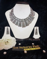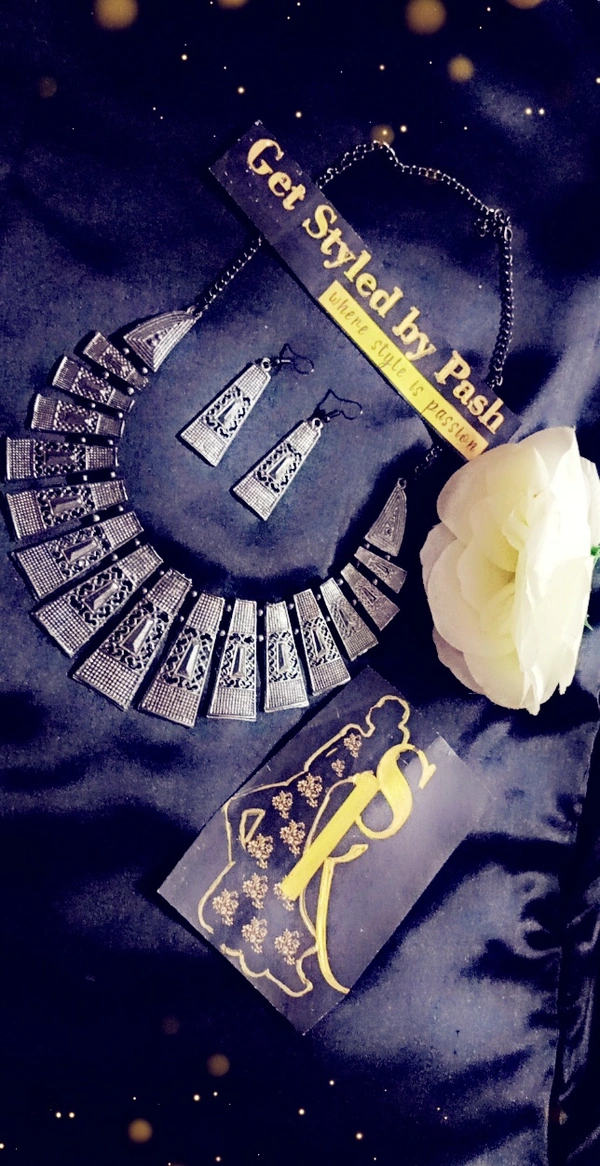 MATERIAL : The metal is alloy with Oxidised German silver plating that gives a dull, yet classy finish to the set. The German silver plating used when combined with the design gives a uniquely traditional look to the jewelry set. The metal is strong and longlasting.