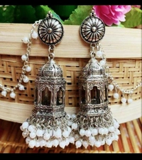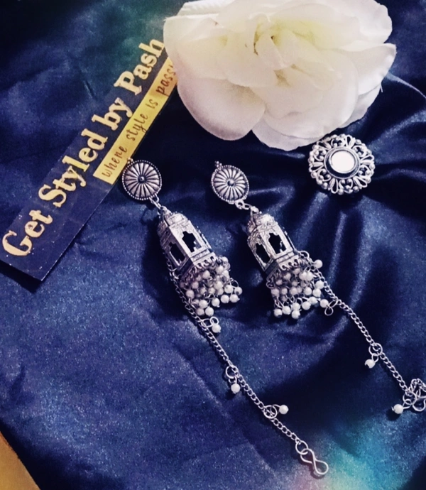 Silver Oxidized Bahubali earrings With Mirror Studded Floral Pattern Ring