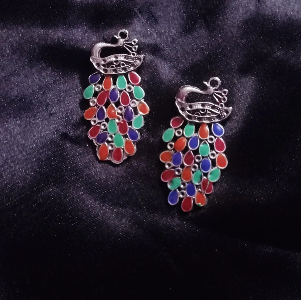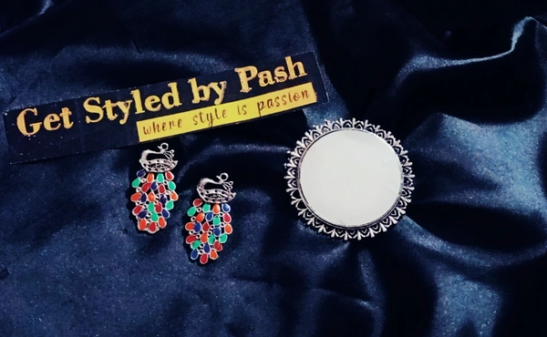 Silver Oxidized Mirror Ring With Multi Coloured Peakcock Earrings