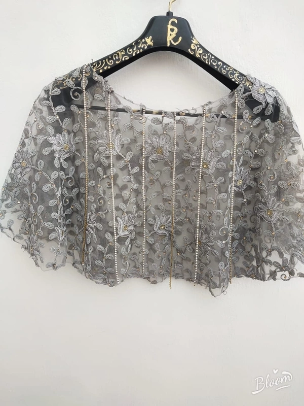 Dazzle up your looks with this beautiful embroidered luxury cape adorned with thread work and real Sarwoski Chains. It is perfect for you club and mocktail party look.